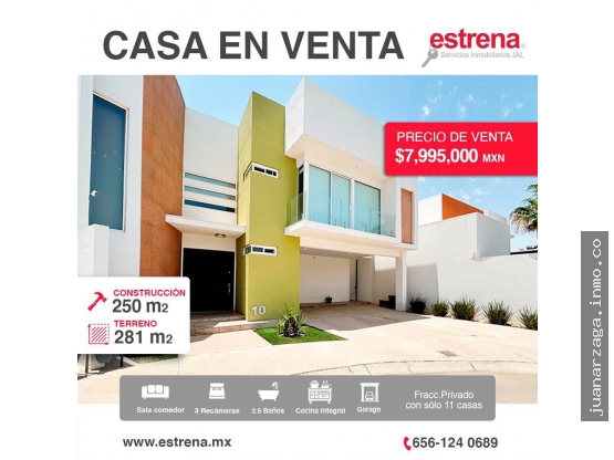 Estrena bonita residencia , como nueva , ubicación Priviligiada , equipadisima , refrigeracin , Cocina integral , amplios espacios en sala y comedor , 3 espaciosas Recámaras , principal con Walk in Closet ,Estancia , patio muy grande , 250 mts construidos , 281 mt de terreno